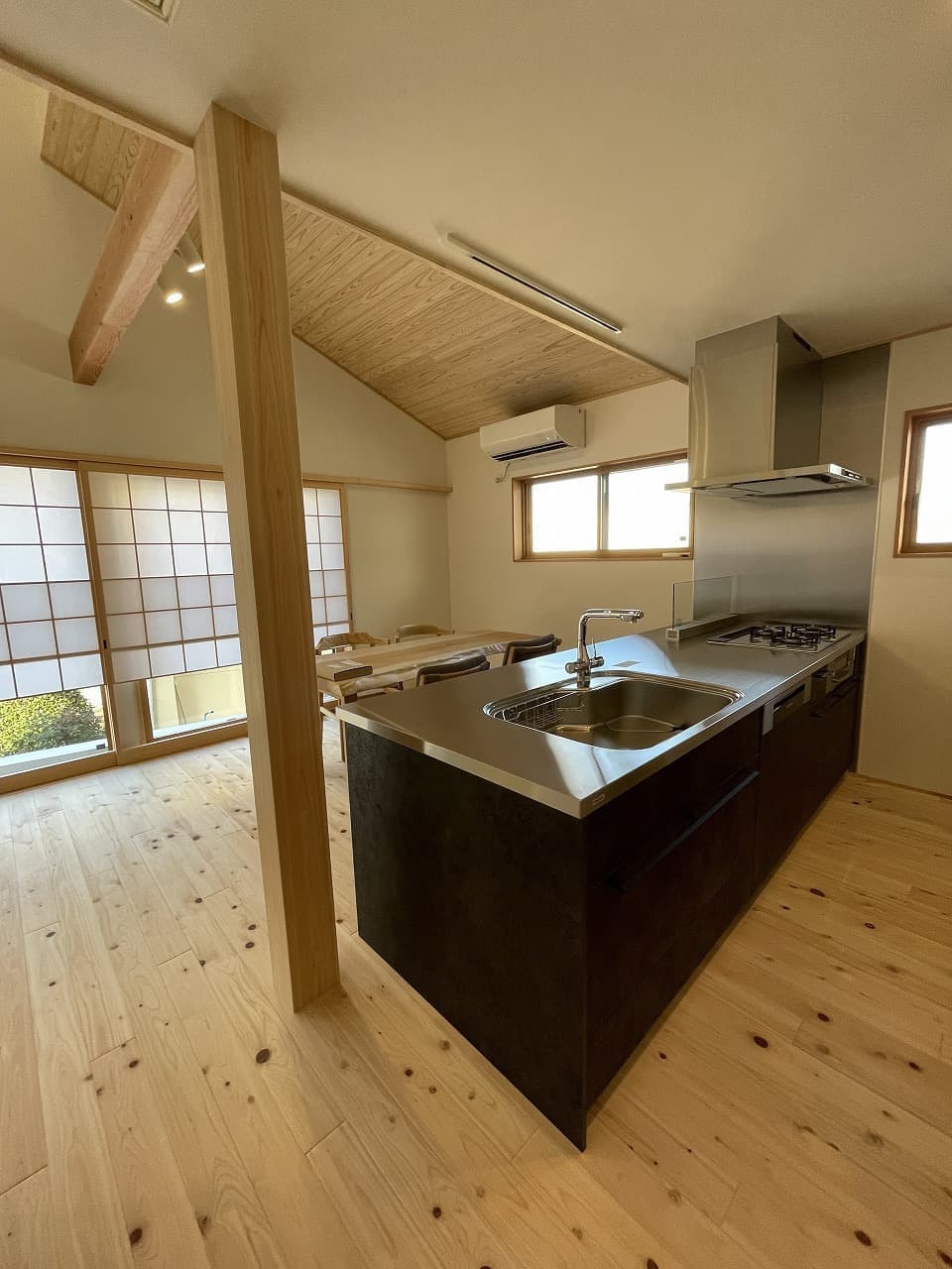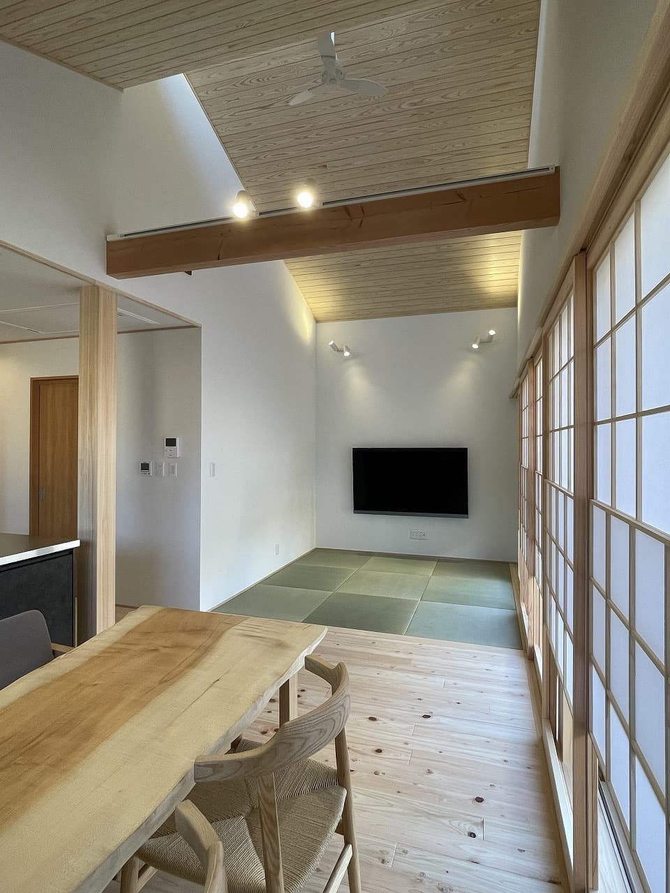 木造軸組み工法/屋根ガルバリウム鋼板縦ハゼ葺/断熱 天井セルロースファイバ・壁ウレタンフォーム吹付/外壁窯業サイディング+塗壁/内装床ヒノキ15㎜/内装珪藻土・土壁パネルモイス/YKK樹脂サッシAPW330/木建具YKK/長府システムバス/システムキッチン(クリナップ)/タンクレストイレ(パナソニック)/玄関ドアYKKスマートKEY/国産畳/第1種換気全館空調/長期優良住宅認定/耐震等級3/省エネ等級4