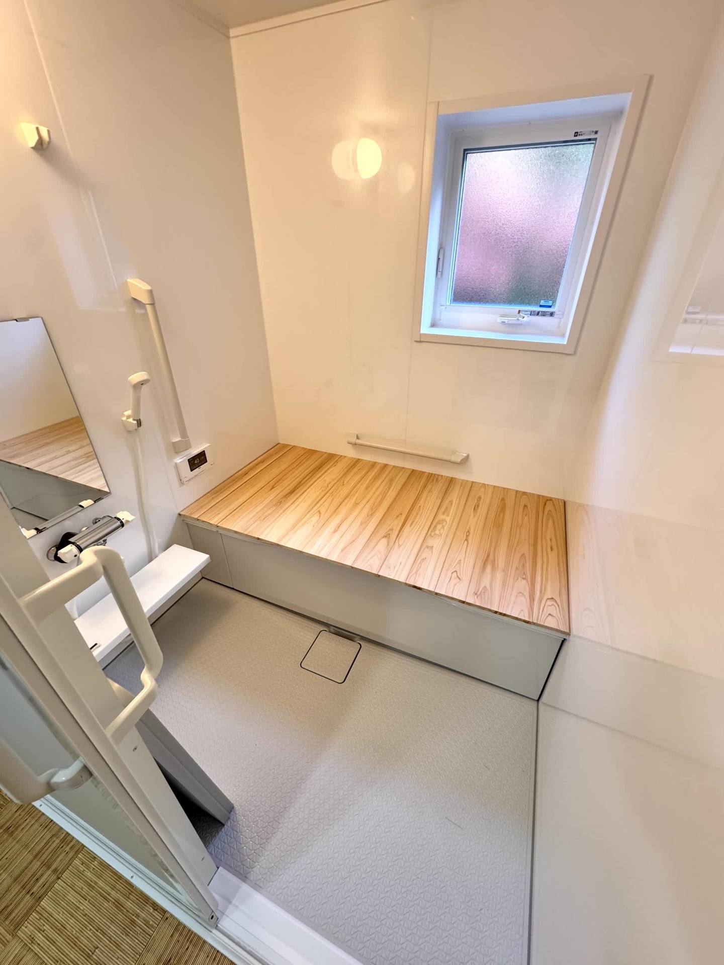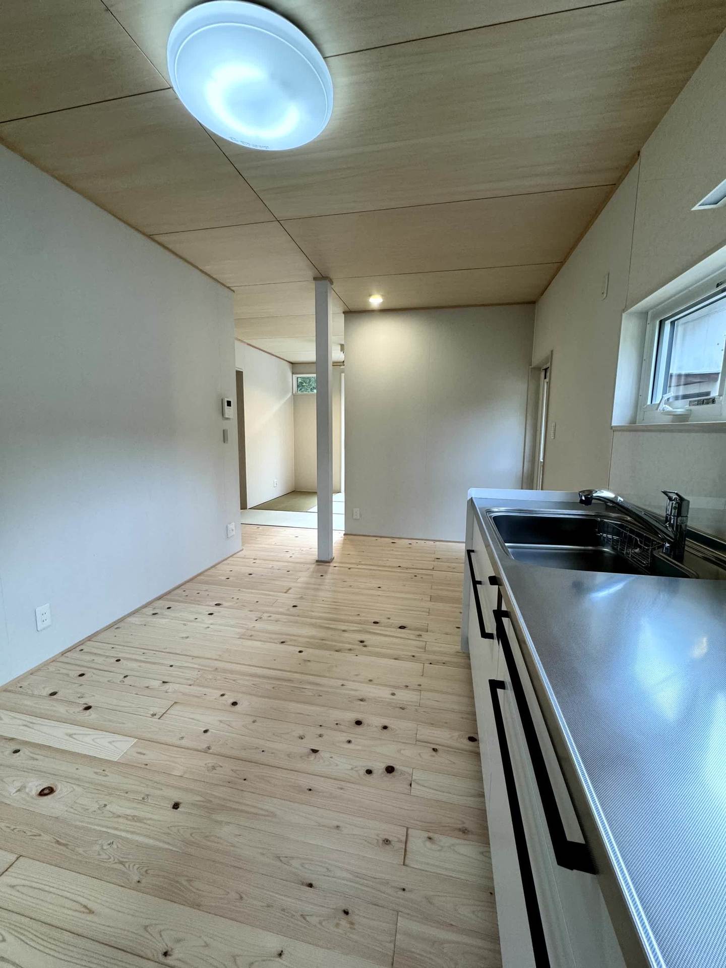 木造住宅/築55年/民家リノベーション/内装 桧15mmフローリング 内装土壁パネルモイス 天井杉羽目板/シナ合板 APW樹脂サッシ キッチンクリナップ 断熱化(床下ウレタン吹付・天井セルロースファイバー300㎜)防蟻処理 2025住宅省エネ補助金利用