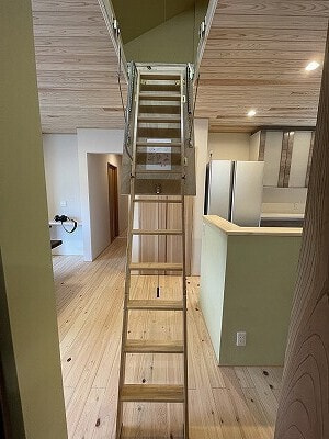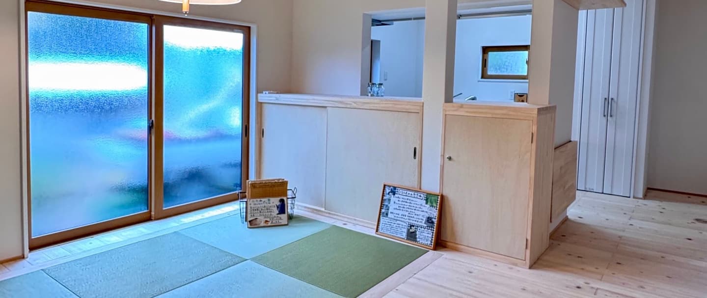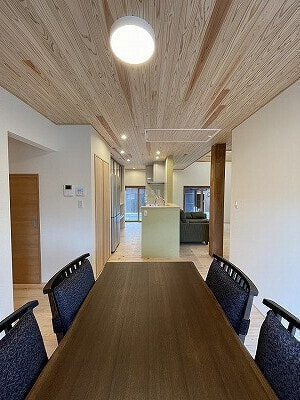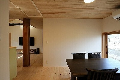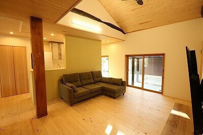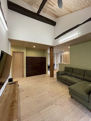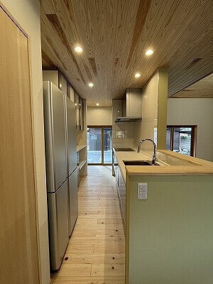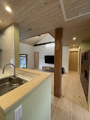 木造住宅/築80年/古民家リノベーション/内装 桧15mmフローリング 内装壁珪藻土 天井杉羽目板 APW樹脂サッシ キッチンクリナップSK 断熱化(床ウレタン吹付80㎜・天井セルロースファイバ250㎜) 防蟻処理 ・玄関ドア木製オーダー片引き戸
