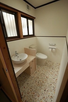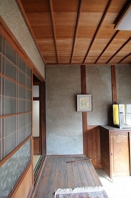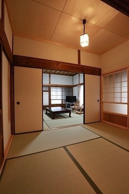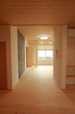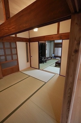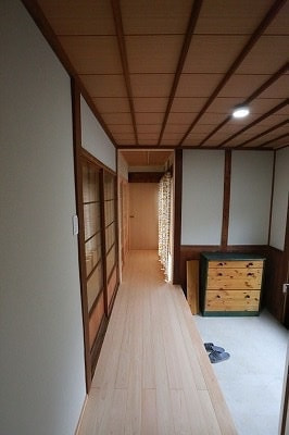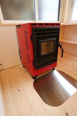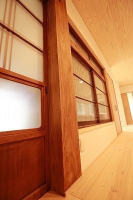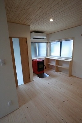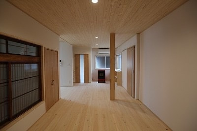 木造住宅/築70年/古民家リノベーション/内装 桧15mmフローリング 内装壁珪藻土 天井ヒノキ羽目板 APW樹脂サッシ キッチンタカラスタンダード 廊下畳 断熱化(床ウレタン吹付80㎜・天井セルロースファイバ300㎜) 防蟻処理 床下換気システム導入 ベレットストーブSS-5