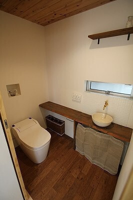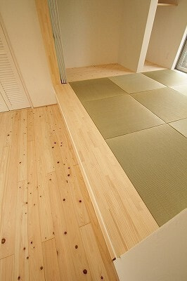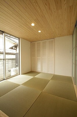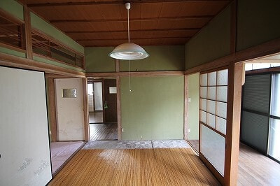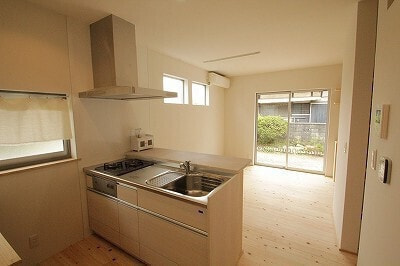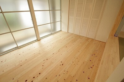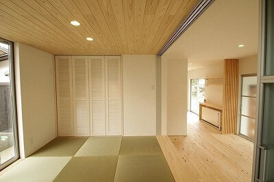 木造住宅/築70年/古民家リノベーション/内装 桧15mmフローリング 内装壁珪藻土 天井ヒノキ羽目板 APW樹脂サッシ キッチンタカラスタンダード 廊下畳 断熱化(床ウレタン吹付80㎜・天井セルロースファイバ300㎜) 防蟻処理 床下換気システム導入 ベレットストーブSS-5