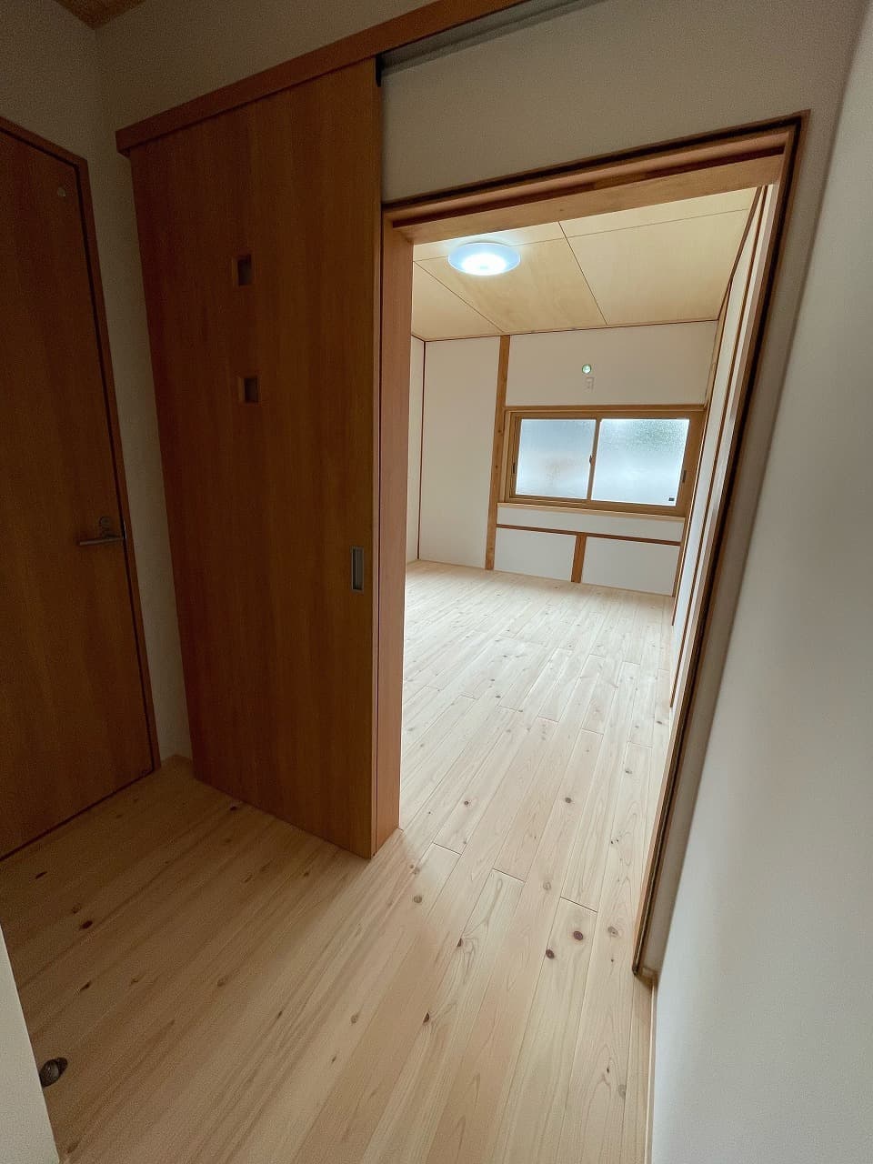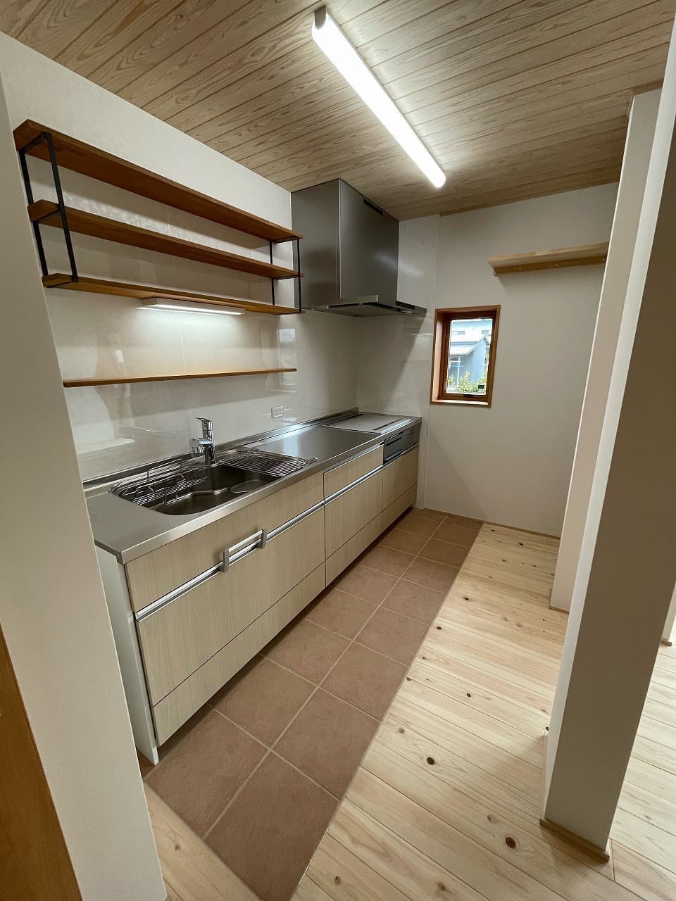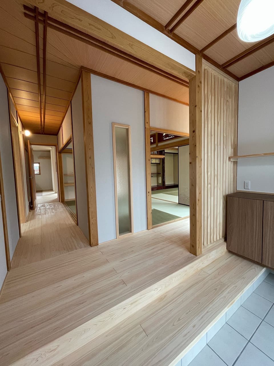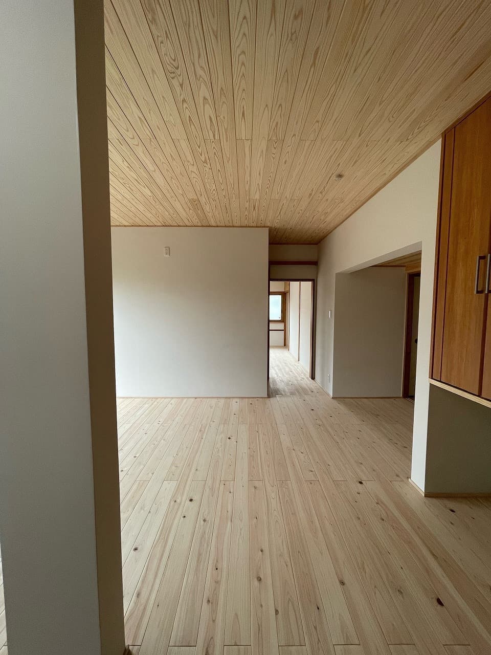 木造住宅/築46年/民家リノベーション/内装 桧15mmフローリング 内装壁珪藻土 天井杉羽目板/シナ合板 APW樹脂サッシ キッチンクリナップSK 断熱化(床ウレタン吹付80㎜・天井ウレタン吹付110㎜) 防蟻処理 ・玄関引戸 アウターシェード 合併浄化槽設置