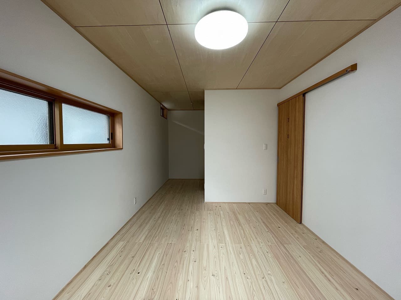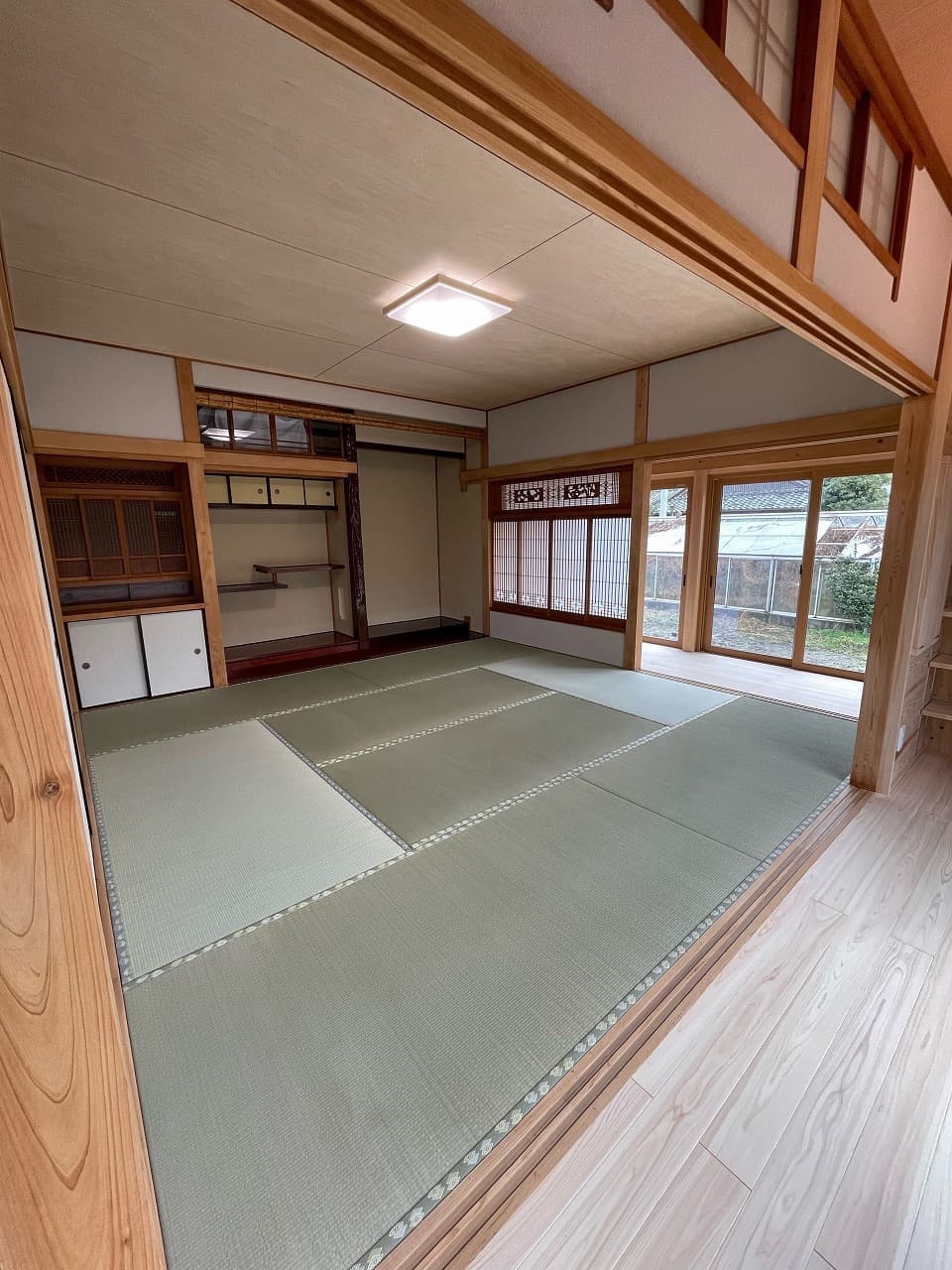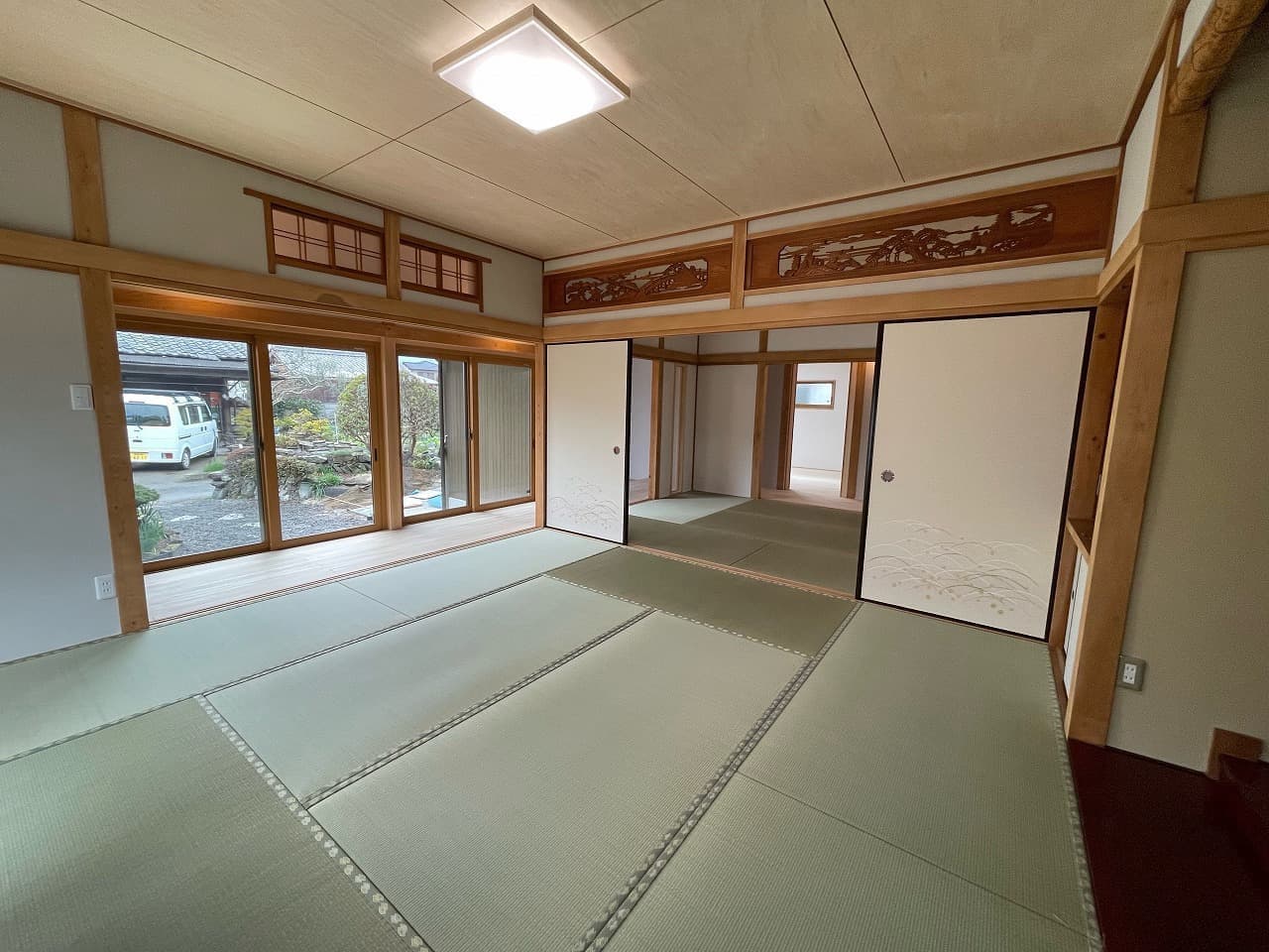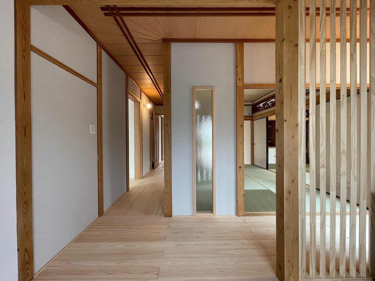 木造住宅/築46年/民家リノベーション/内装 桧15mmフローリング 内装壁珪藻土 天井杉羽目板/シナ合板 APW樹脂サッシ キッチンクリナップSK 断熱化(床ウレタン吹付80㎜・天井ウレタン吹付110㎜) 防蟻処理 ・玄関引戸 アウターシェード 合併浄化槽設置