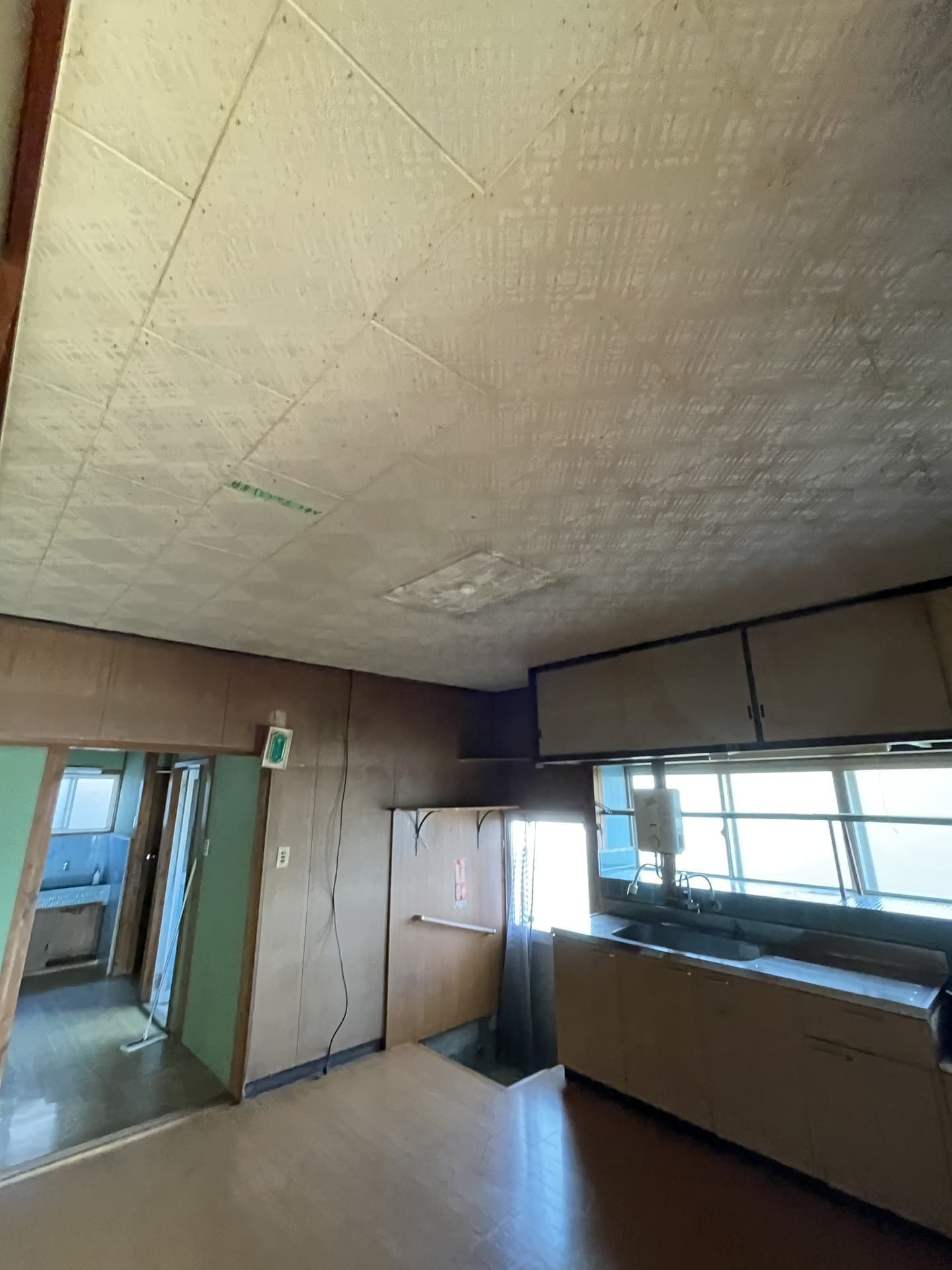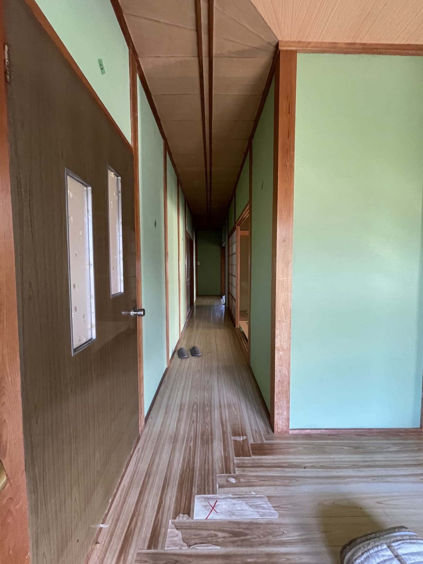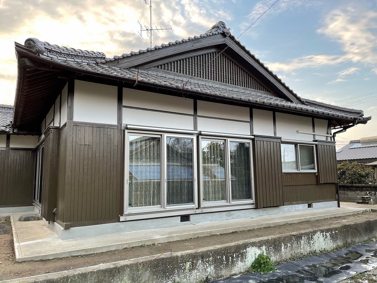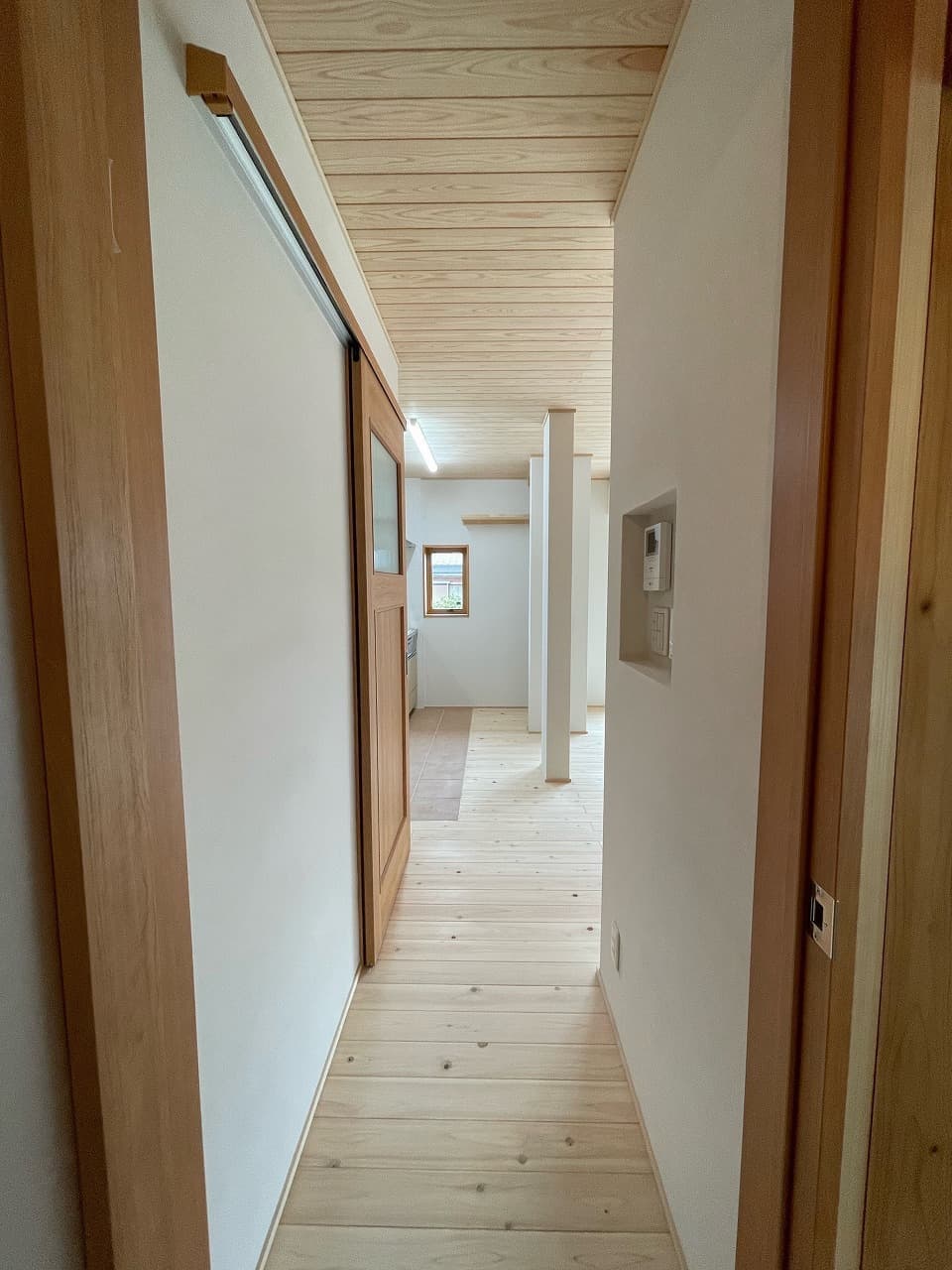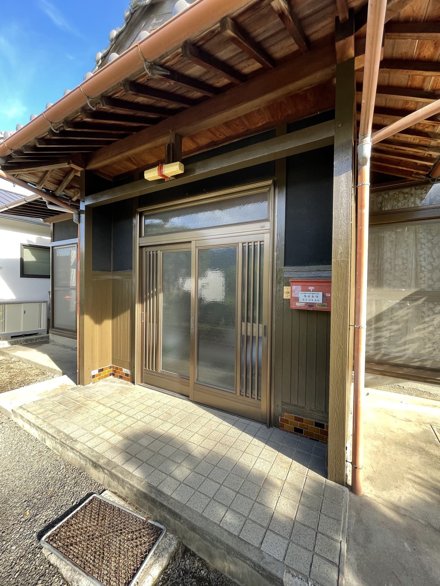 木造住宅/築46年/民家リノベーション/内装 桧15mmフローリング 内装壁珪藻土 天井杉羽目板/シナ合板 APW樹脂サッシ キッチンクリナップSK 断熱化(床ウレタン吹付80㎜・天井ウレタン吹付110㎜) 防蟻処理 ・玄関引戸 アウターシェード 合併浄化槽設置