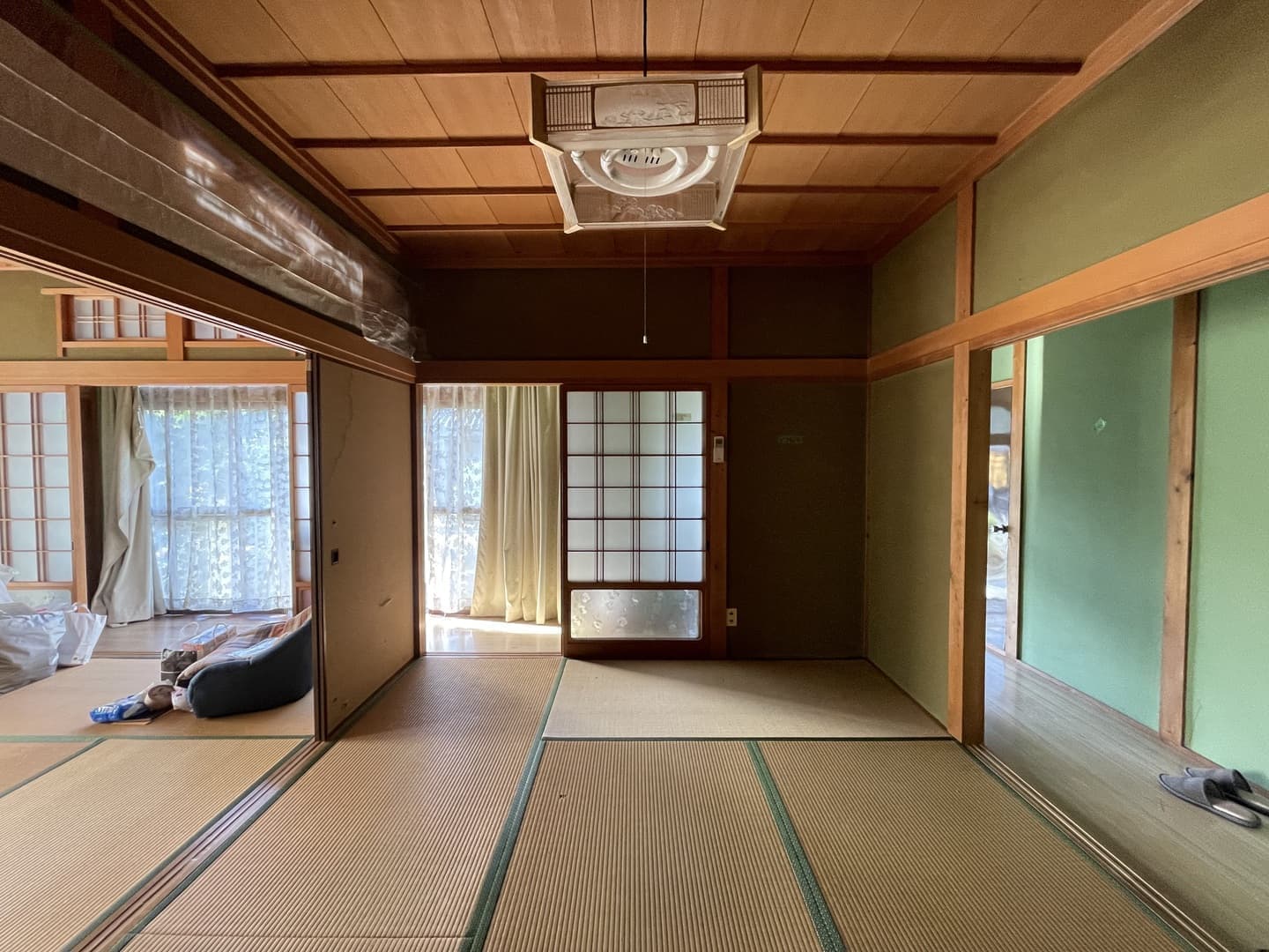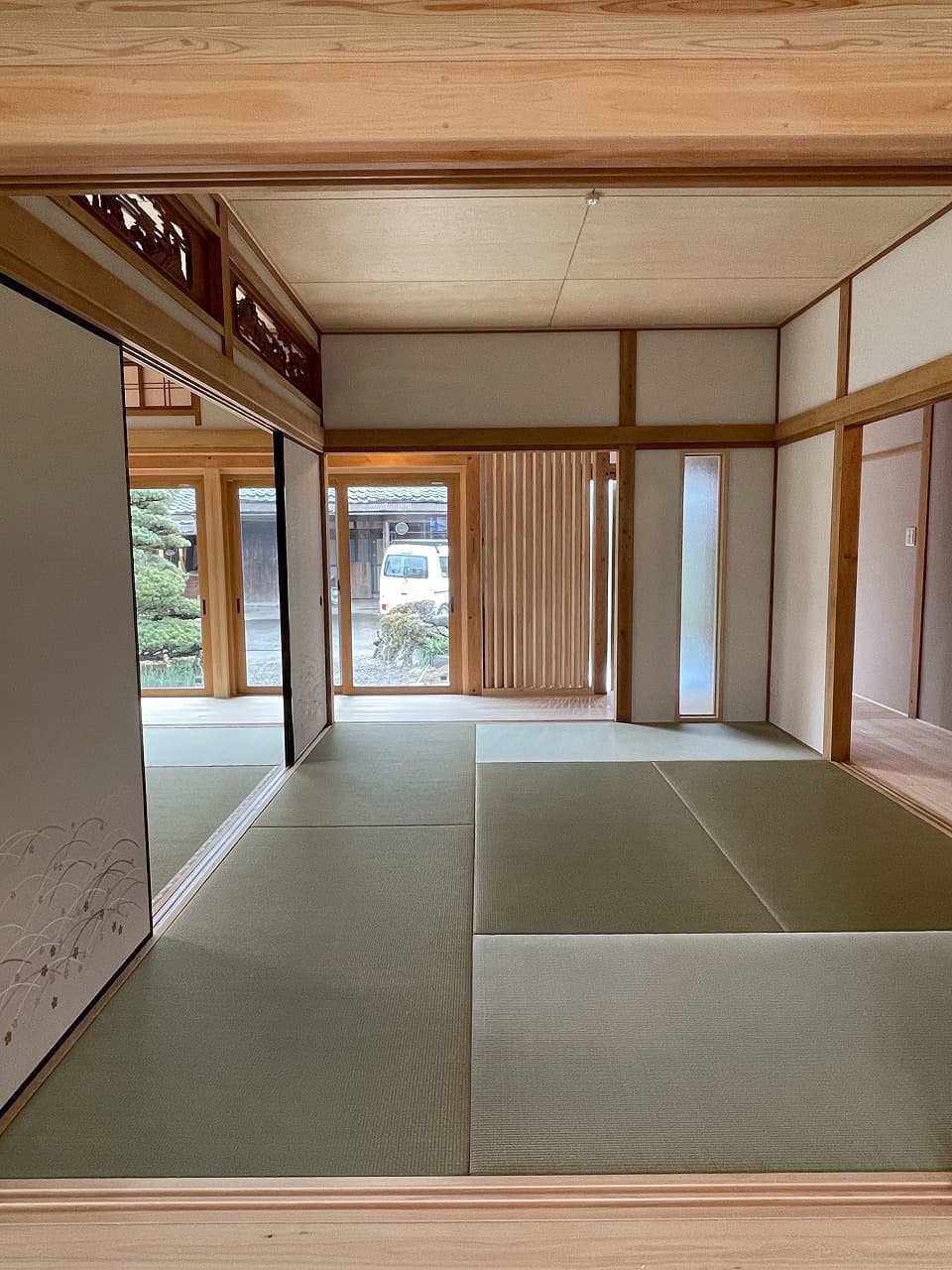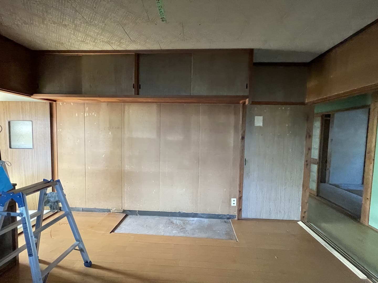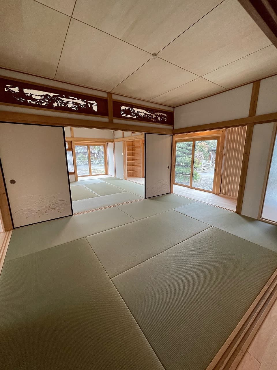 木造住宅/築46年/民家リノベーション/内装 桧15mmフローリング 内装壁珪藻土 天井杉羽目板/シナ合板 APW樹脂サッシ キッチンクリナップSK 断熱化(床ウレタン吹付80㎜・天井ウレタン吹付110㎜) 防蟻処理 ・玄関引戸 アウターシェード 合併浄化槽設置