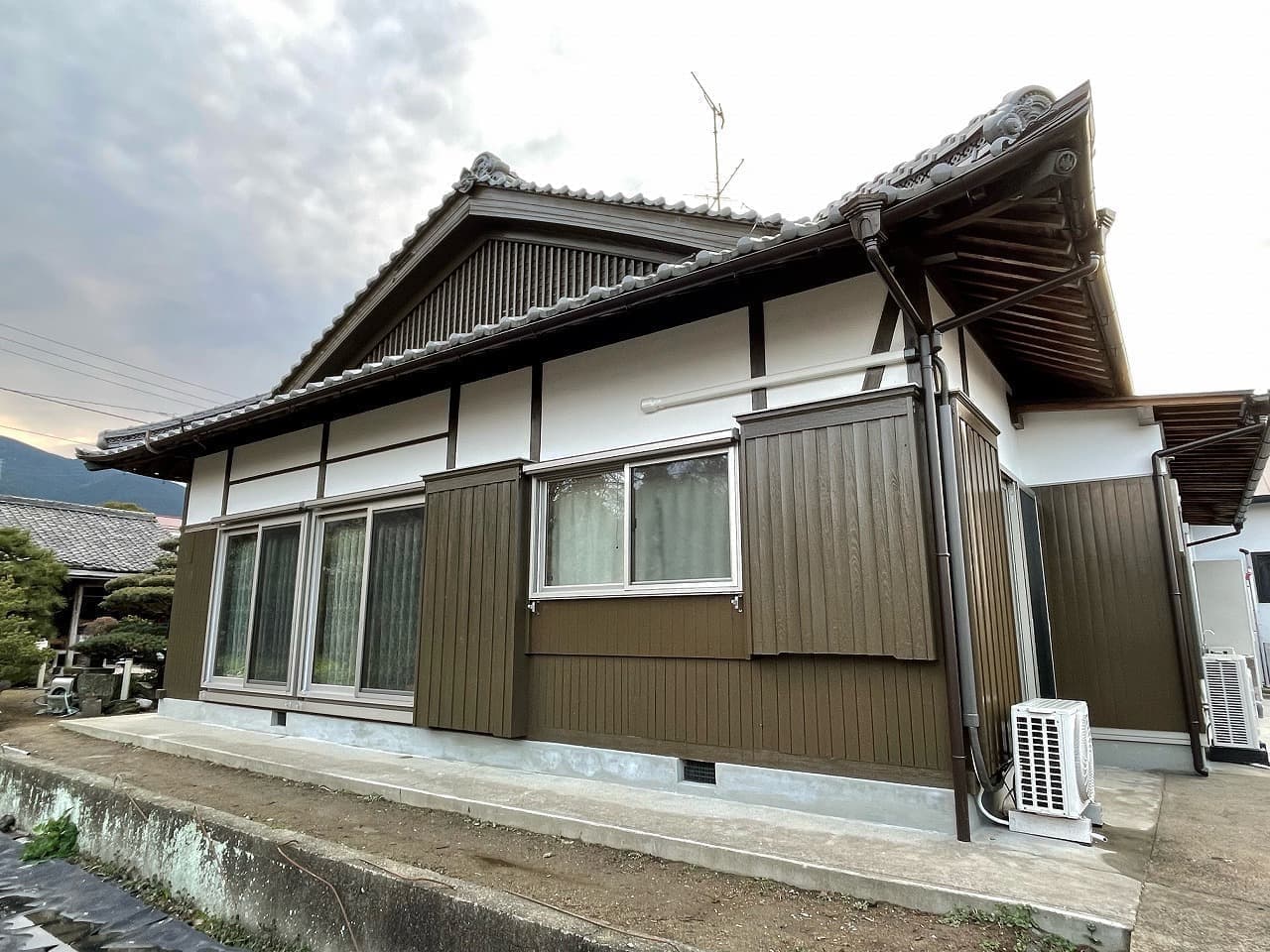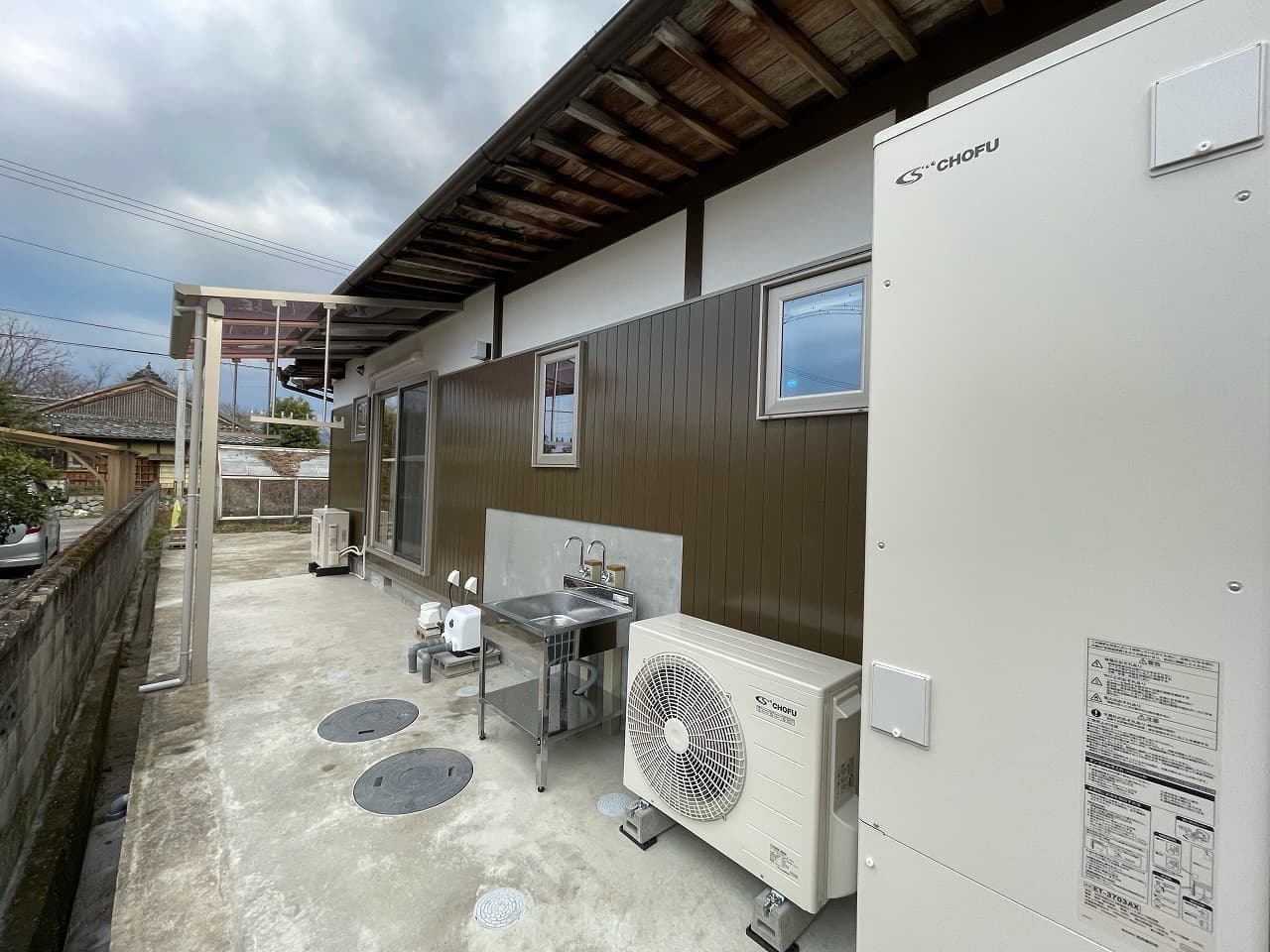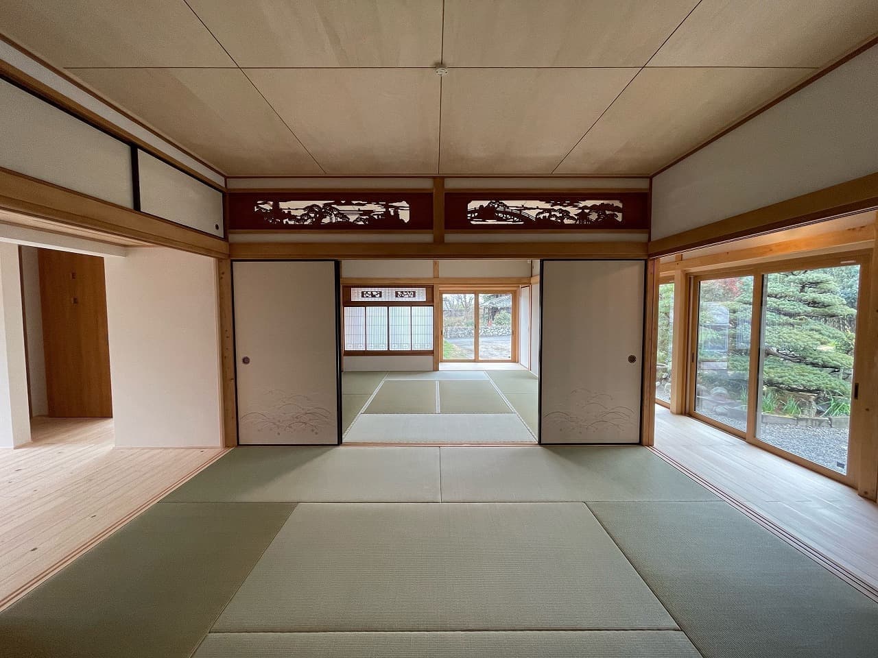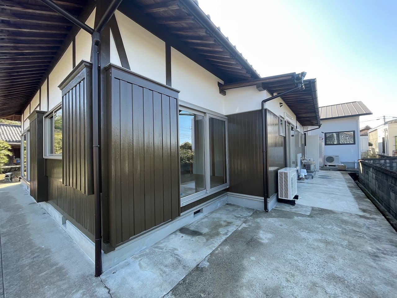 木造住宅/築46年/民家リノベーション/内装 桧15mmフローリング 内装壁珪藻土 天井杉羽目板/シナ合板 APW樹脂サッシ キッチンクリナップSK 断熱化(床ウレタン吹付80㎜・天井ウレタン吹付110㎜) 防蟻処理 ・玄関引戸 アウターシェード 合併浄化槽設置